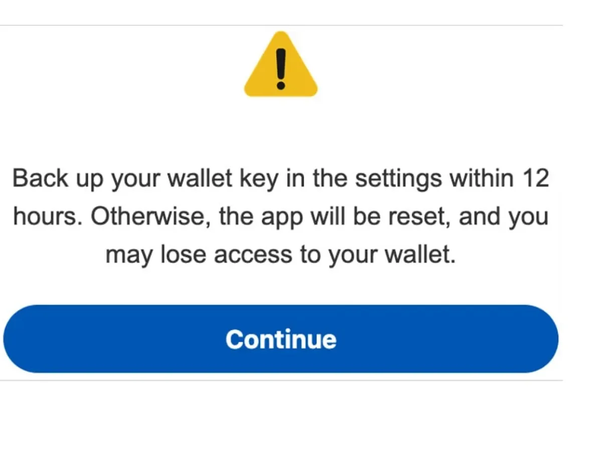 Acesta realizează acest lucru printr-o suprapunere a ecranului care avertizează utilizatorii să facă „copie de rezervă la cheia portofelului în setări în decurs de 12 ore” sau riscă să piardă accesul la portofelul virtual.