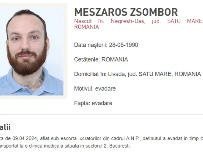 „Marti, 09.04.2024, în jurul orei 15:00, s-a constatat că deţinutul MESZAROS ZSOMBOR, în vârstă de 34 de ani, condamnat definitiv la 18 ani de închisoare pentru săvârşirea infracţiunii de omor, clasificat în regim de maximă sigurantă, aflat în custodia Penitenciarului- Spital Bucureşti- Rahova, a părăsit mijlocul de transport detinuti, stationat in zona clinicii Hiperdia Ritmului, strada Ritmului nr 24, sector 2, Bucuresti”, anunţă Administraţia Naţională a Penitenciarelor.