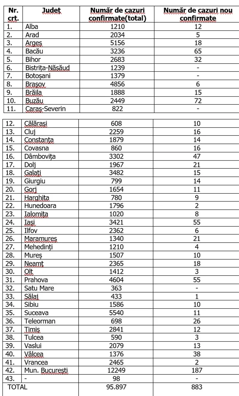 În total, în România s-au înregistrat până în prezent 95.897 de cazuri de infectare cu coronavirus, iar 3.926 de persoane diagnosticate cu infecție cu COVID-19 au murit.