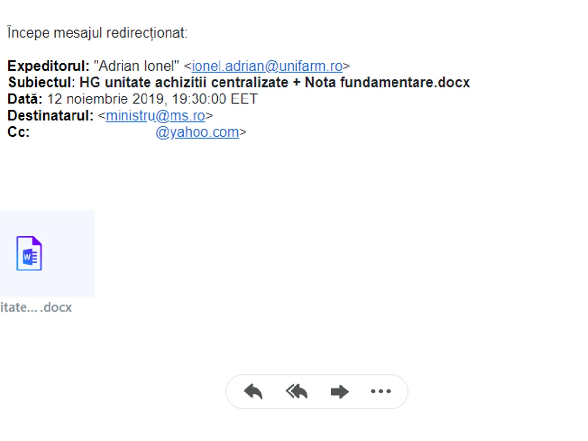 Pe 12 noiembrie 2019, el i-a trimis pe mail fostului ministru Victor Costache un proiect de hotărâre de guvern privind desemnarea C.N. UNIFARM S.A. ca unitate de achiziții centralizată, hotărâre însoțită și de o notă de fundamentare.