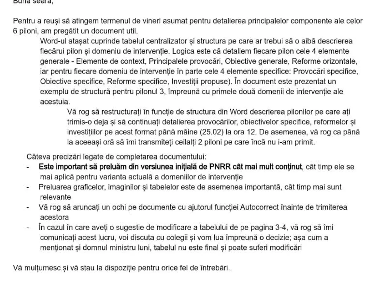 Mesajul este semnat de Lóránt Köszegi, membru PLUS (partidul lui Ghinea), de la Direcția de Cooperare Europeană și Internațională din MIPE. E-mail-ul este trimis mai multor colegi din MIPE în februarie a.c., inclusiv secretarului de stat Marius Vasiliu și șefului tehnic al PNRR, Nicolae Toderaș. În mesaj se scrie, negru pe alb: "Este important să preluăm din versiunea inițială de PNRR cât mai mult conținut".
