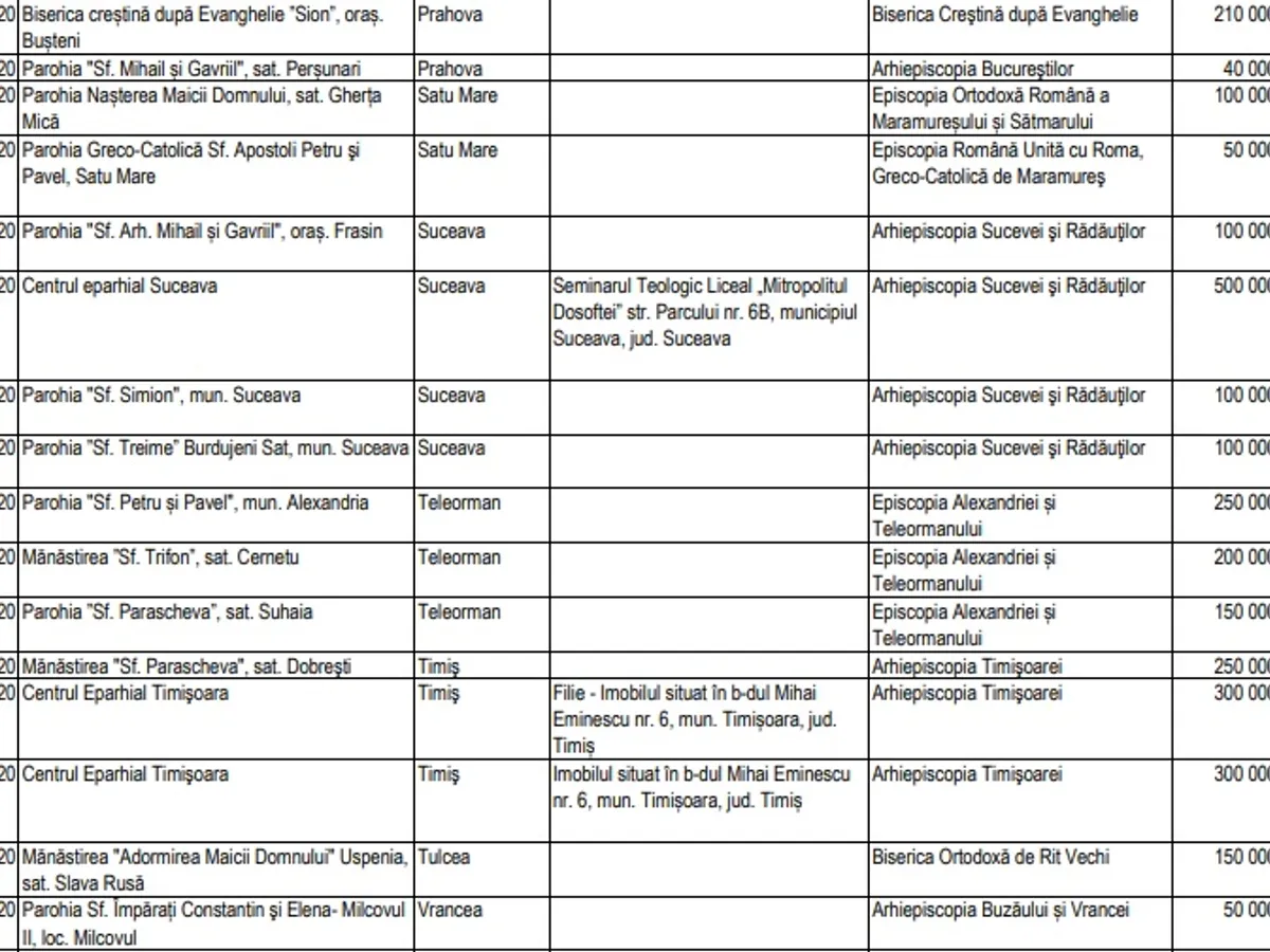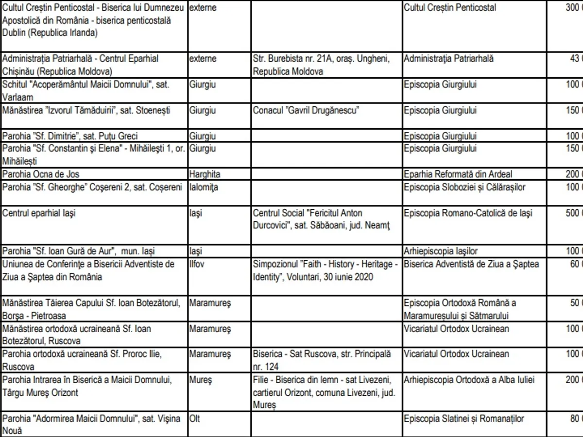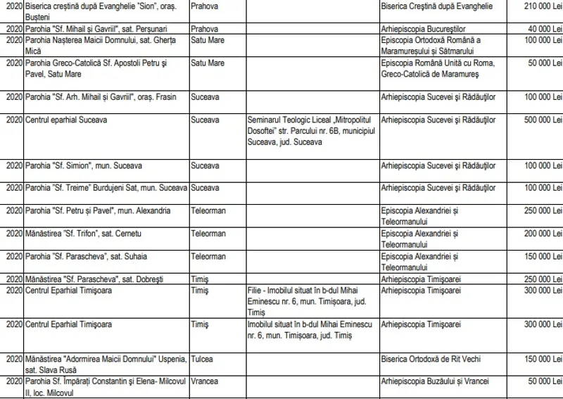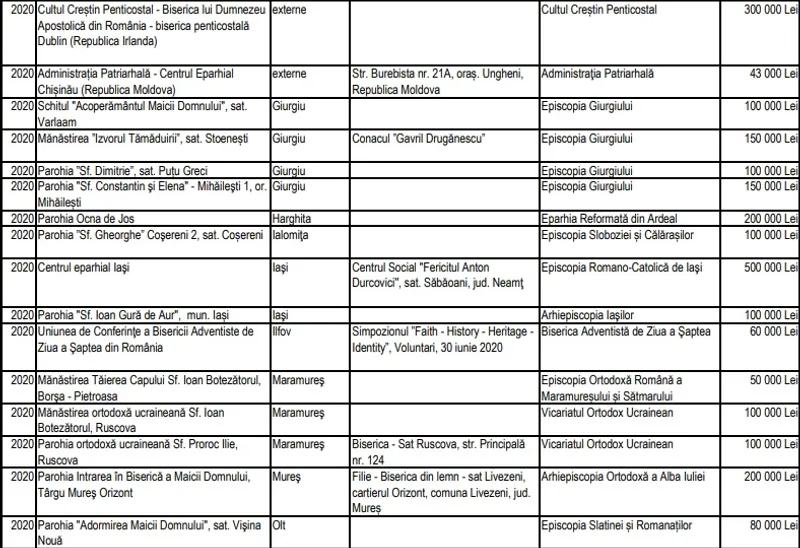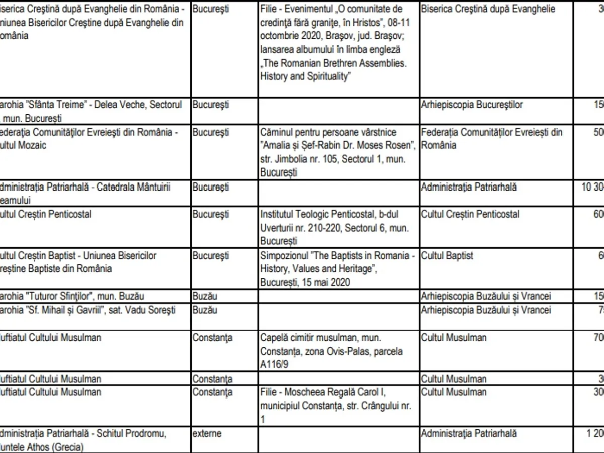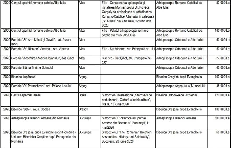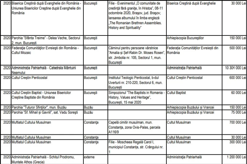 Potrivit informațiilor puse la dispoziția Newsweek România de către Secretariatul de Stat pentru Culte, valoarea sprijinului financiar alocat de către SSC în perioada 1 ianuarie 2020 - 14 august 2020 se ridică la 19.969.000 de lei (vezi detalii în tabelul de mai jos). Asta înseamnă de 6,2 mai puțini bani decât au fost alocați la ultima rectificare bugetară, a doua de anul acesta.