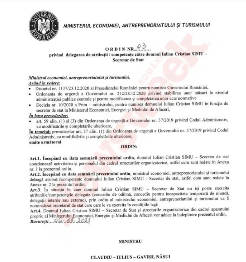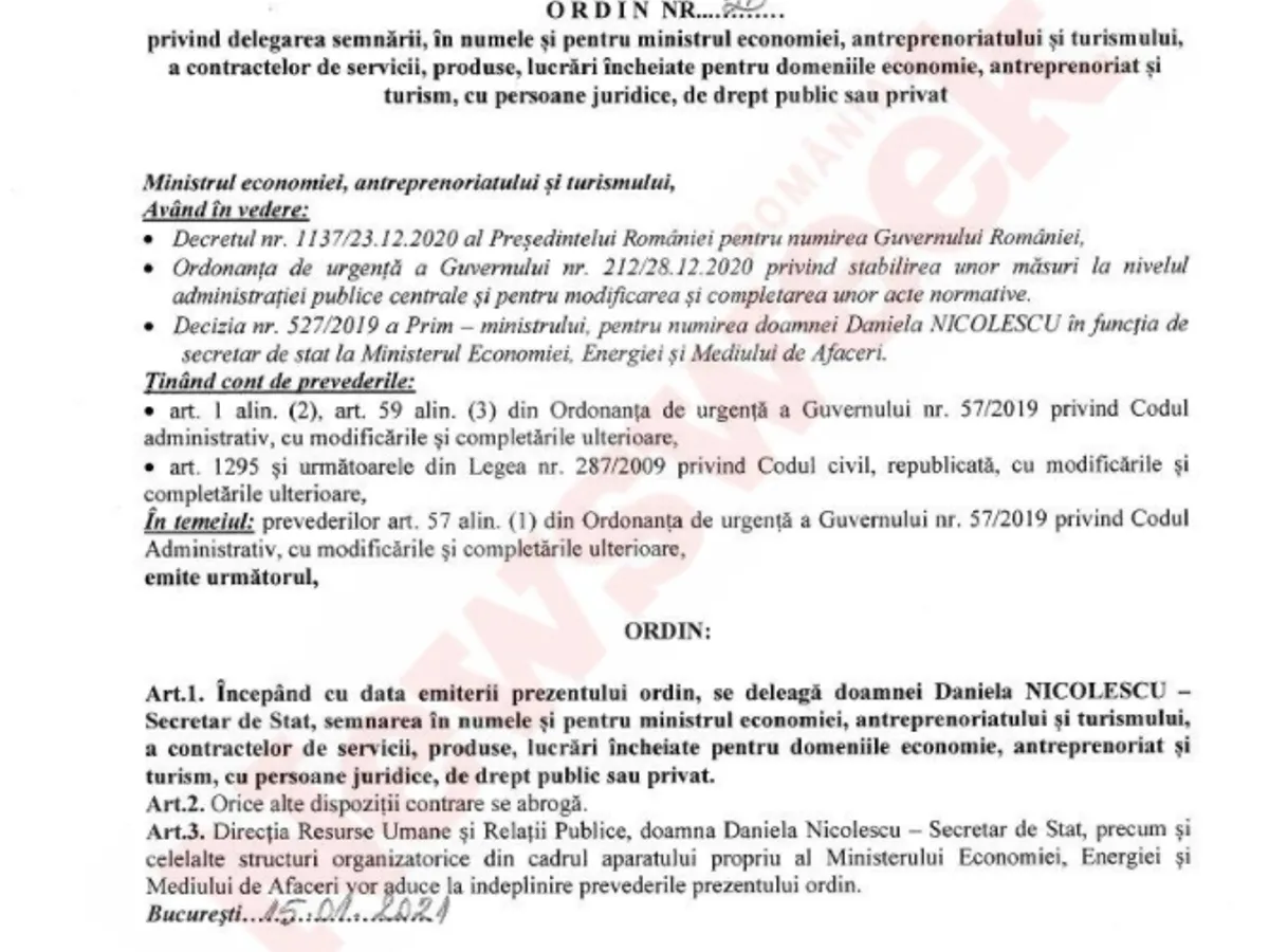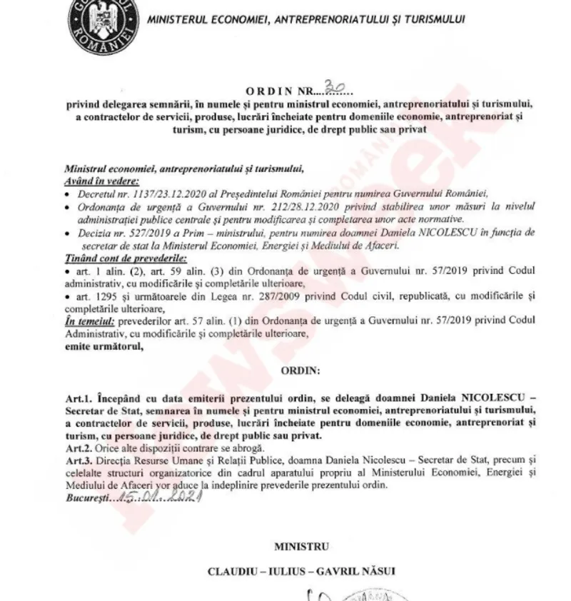 Claudiu Năsui a emis Ordinul 30 din data de 15 ianuarie 2021 prin care a decis ca secretarul de stat liberal Daniela Nicolescu să-i preia o parte din atribuții: „Începând cu data emiterii prezentului ordin, se deleagă doamnei Daniela Nicolescu – Secretar de Stat, semnarea în numele și pentru ministrul economiei, antreprenoriatului și turismului, a contractelor de servicii, produse, lucrări încheiate pentru domeniile economiei, antreprenoriat și turism, cu persoanele juridice de drept public sau privat”.