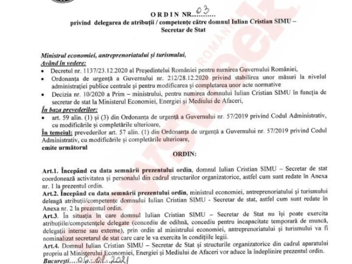Celălalt secretar de stat, Iulian Simu, numit pe funcție de Guvernul Orban, se ocupa de Industria de Apărare din cadrul ministerului Economiei. Dar actualul ministru Claudiu Năsui a decis printr-un ordin emis pe 6 ianuarie ca secretarul de stat Iulian Simu să preia și domeniul Resurselor Umane, care cuprinde: avizarea actelor administrative cu caracter individual, actele administrative pentru constituirea comisiilor de concurs, aprobă fișe de post, concedii, gestionează documentele și corespondența structurilor coordonate și aprobă deplasările în străinătate.