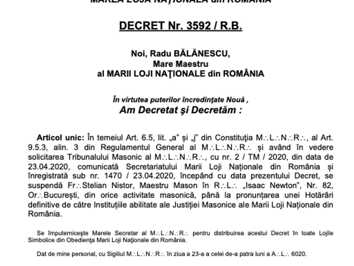 „În temeiul Art. 6.5, lit. „a” și „j” din Constituţia MLNR, al Art. 9.5.3, alin. 3 din Regulamentul General al MLNR și având în vedere solicitarea Tribunalului Masonic al MLNR cu nr. 2 / TM / 2020, din data de 23.04.2020, comunicată Secretariatului Marii Loji Naționale din România și înregistrată sub nr. 1470 / 23.04.2020, începând cu data prezentului Decret, se suspendă Fr.Stelian Nistor, Maestru Mason în RL „Isaac Newton”, Nr. 82, Or. București, din orice activitate masonică, până la pronunțarea unei Hotărâri definitive de către Instituțiile abilitate ale Justiției Masonice ale Marii Loji Naționale din România”. Decretul este contrasemnat de către marele secretar Cătălin Tohăneanu și de către Marele Orator Ovidiu Galeș.