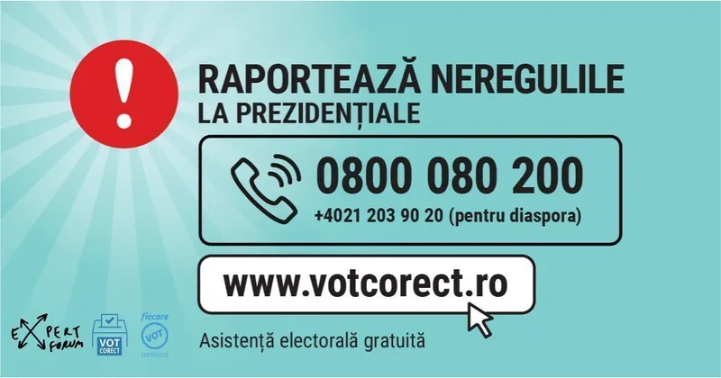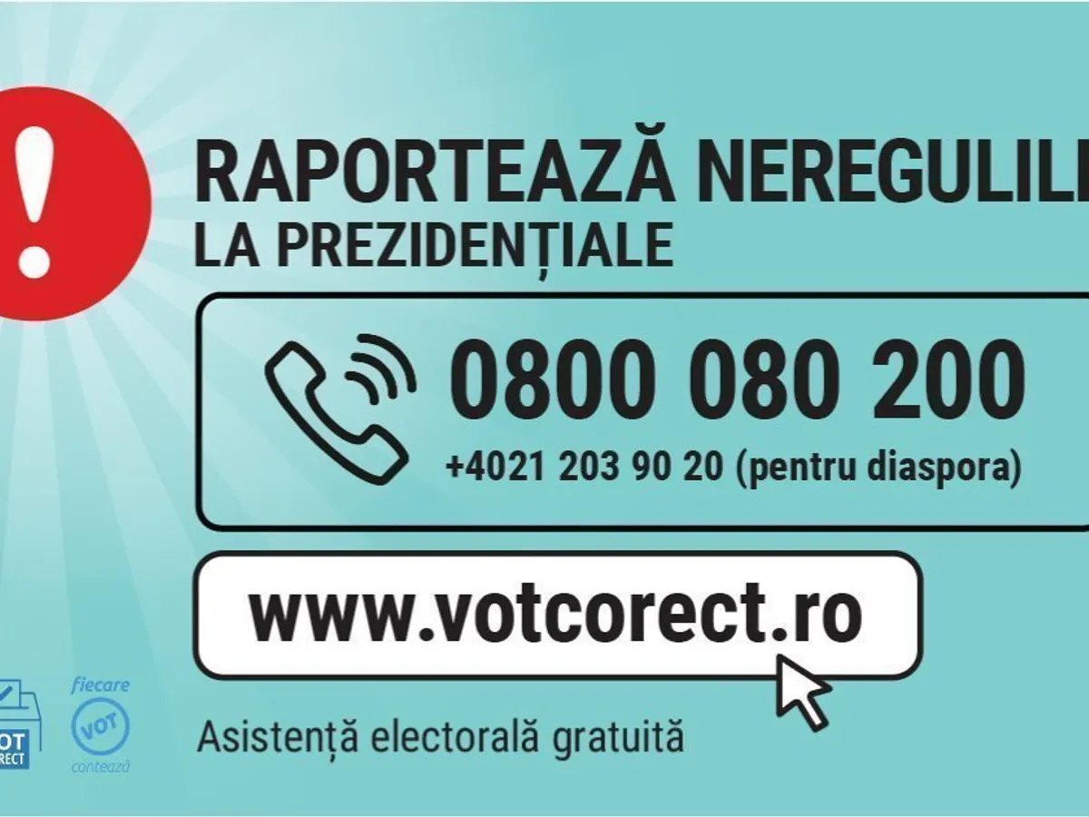 Call center 0800 080 200 și platforma www.votcorect.ro pentru sesizarea neregulilor la prezidențiale.Vom răspunde tuturor întrebărilor, sesizărilor și nelămuririlor legate de alegerile prezidențiale. Lista de reguli și întrebări este actualizată constant, pentru a lua în calcul hotărârile emise de AEP și BEC.