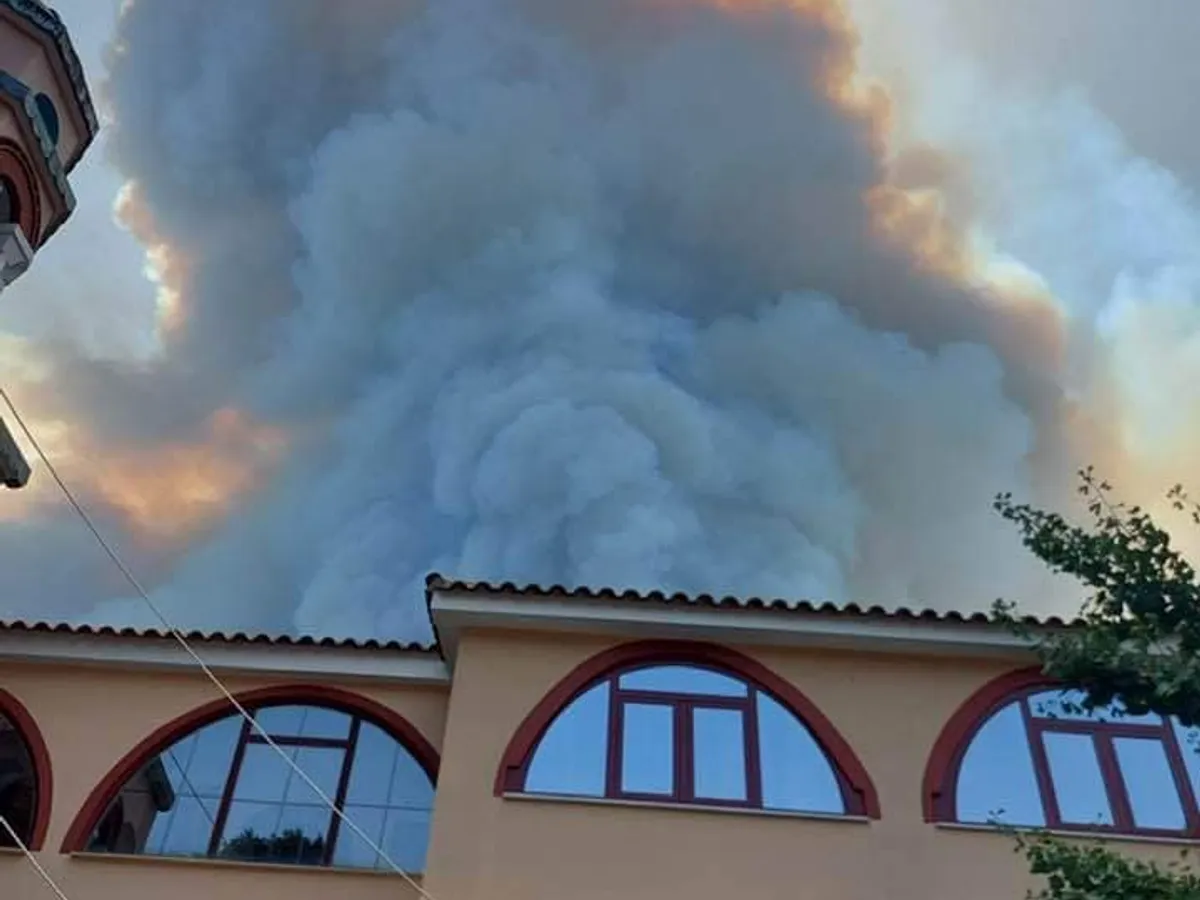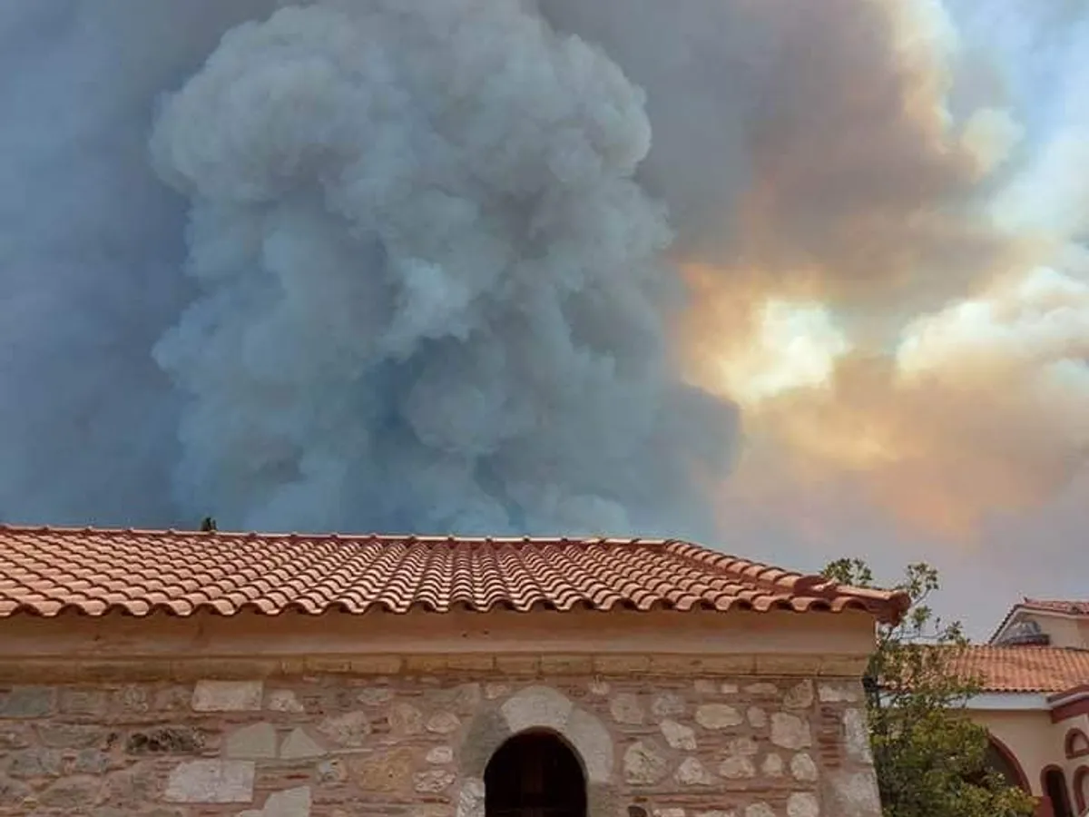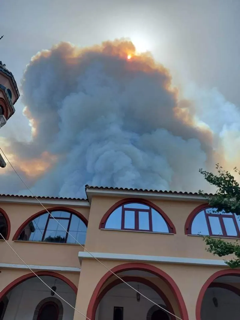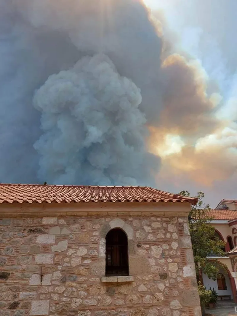 Insula Evia a fost cuprinsă de flăcări care puteau fi văzute de pe mare, în timp ce pompierii greci și-au arătat neputința de a lupta cu focul din cauza dealurilor înalte și a vizibilității reduse. Peste 150 de case au fost distruse în urma incendiului, la fel și pădurea de pini din jurul mănăstirii Sfântului Cuvios David, numită și „Osios David”. În biserica acestei mănăstiri ortodoxe se află cinstitul Cap al Sfântului David cel Bătrân, cât și mormântul Cuviosului Iakov Tsalikis.