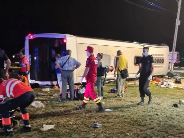 FOTO 23 de ucraineni, răniți după ce autocarul lor s-a răsturnat pe E85. A fost activat Planul Roșu