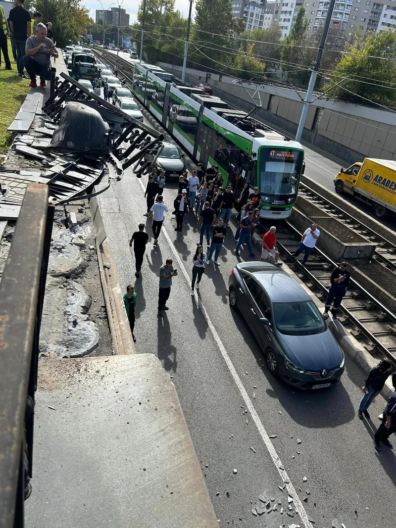 Accident ca în filme! Un șofer a pierdut controlul și a sărit cu mașina în Pasajul Lujerului. A accelerat atât de puternic la ieșirea din parcarea mall-ului Plaza Romania, încât a rupt gardul din fier al pasajului și a sărit cu mașina până pe șinele tramvaiului 41.