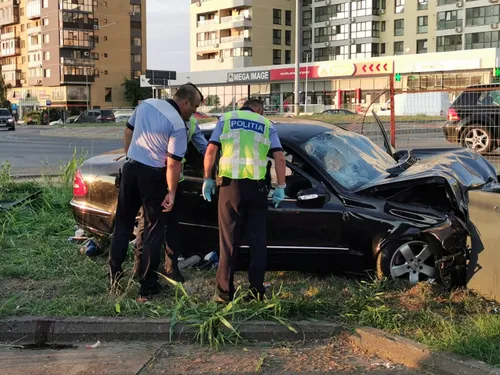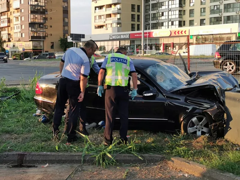 FOTO Accident mortal în Constanța: Un Mercedes a sărit din giratoriu și s-a înfipt într-un stâlp