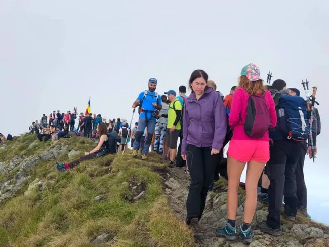 Pe rețelele sociale au apărut poze și filmări cu turiști așteptându-se unii pe alții în drum spre Vârful Moldoveanu, cel mai înalt din România.