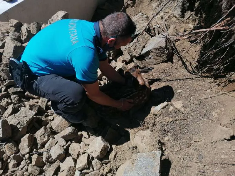 Un pui de căprioară a fost salvat de jandarmii montani în Masivul Parâng, animalul fiind blocat între resturi de materiale şi pietre ce au rămas de la construcţia drumului spre staţiunea Parâng.