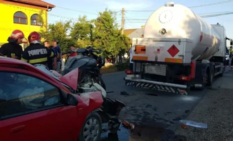 În localitatea Malu Spart, județul Giurgiu, a avut loc un accident rutier deosebit de grav în weekend. O motocicletă a fost strivită între un autoturism și o cisternă.