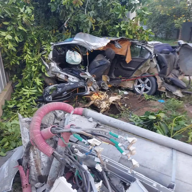 FOTO Ce a rămas dintr-un BMW după ce a rupt un stâlp de beton. Șoferul și un pasager au murit pe loc