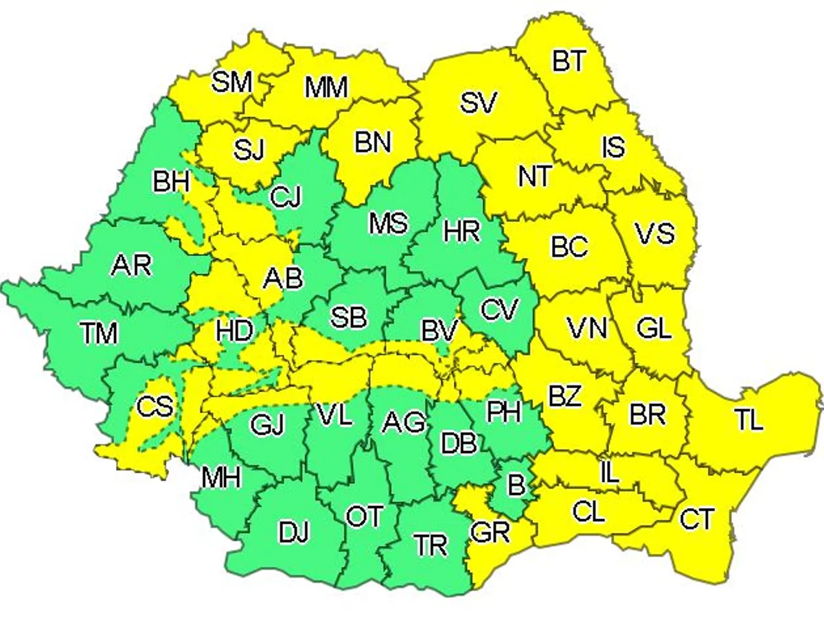 Judeţele vizate de noua atenţionare Cod galben sunt: Alba, Argeş, Bacău, Bihor, Bistriţa-Năsăud, Brăila, Botoşani, Braşov, Buzău, Cluj, Călăraşi, Caraş-Severin, Constanţa, Dâmboviţa, Gorj, Galaţi, Giurgiu, Hunedoara, Ialomiţa, Iaşi, Mehedinţi, Maramureş, Neamţ, Prahova, Sibiu, Sălaj, Satu Mare, Suceava, Tulcea, Vâlcea, Vrancea şi Vaslui.