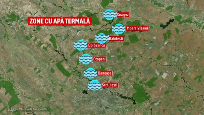 Potrivit datelor Agenției Naționale de Resurse Minerale, pânza de apă termală se întinde pe o suprafaţă care începe de la Casa Presei Libere, trece prin Otopeni, Baloteşti şi ajunge la Snagov.
