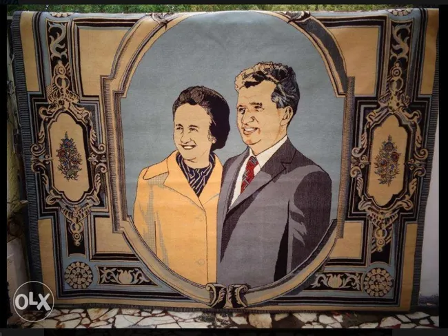 Un bucureștean a scos în luna iulie, la vânzare, un covor țesut manual, din lână, pe care apar portretele soților Nicolae și Elena Ceaușescu.