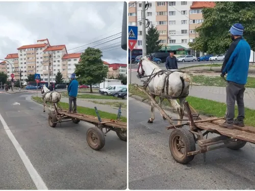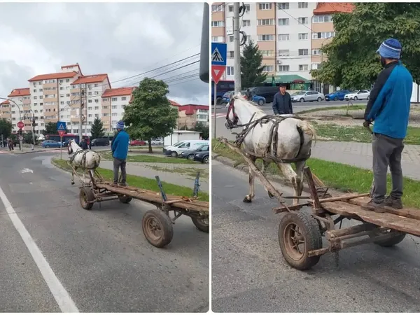 Un bărbat s-a plimbat kilometri întregi prin oraș stând în picioare în căruță. Momentul a fost surprins de cetățenii surprinși de „acrobatul” de ocazie.