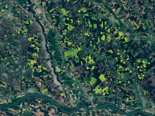 Satelitul Landsat 8 al NASA Earth a surprins recent exploziile de culoare ale câmpurilor agricole din sudul României, în zona unde se intersectează râul Olt cu Dunărea.