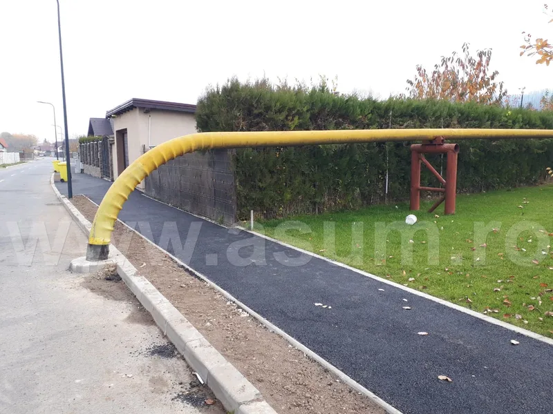 Ca tabloul prostiei să fie complet, conducta de gaz traversează aerian trotuarul la o înălțime de aproximativ 1,60 metri, relatează asum.ro.
