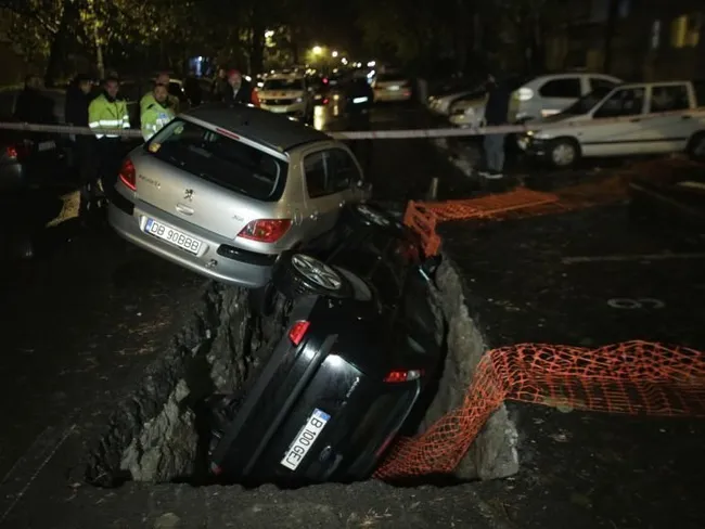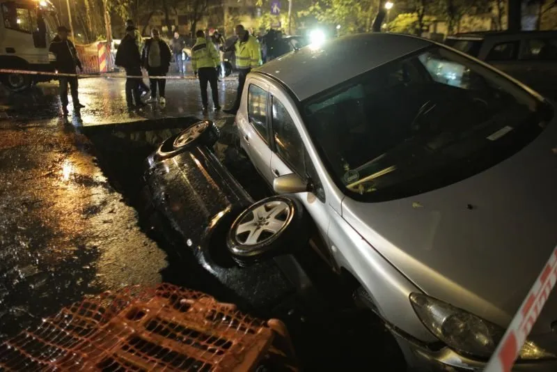 FOTO Două mașini au căzut într-o groapă RADET, la București