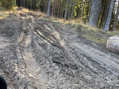 FOTO Drumul de acces în staţiunea Peştera-Padina, DJ 714, distrus de camioanele de transport lemne