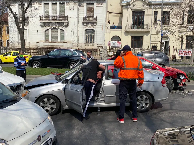 FOTO EXCLUSIVE Accident grav, la Piața Romană. Unui șofer i s-a făcut rău și a sărit pe contrasens