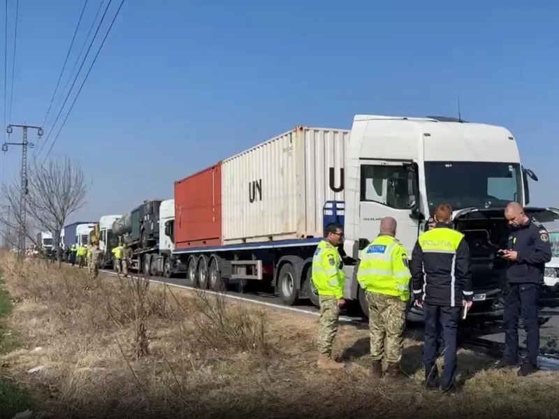 Trei camioane înmatriculate în Marea Britanie (UK), încărcate cu echipamente militare NATP, au fost implicate, luni, 4 martie 2024, într-o tamponare în lanţ care s-a produs pe DN 1, în zona localităţii prahovene Băicoi.