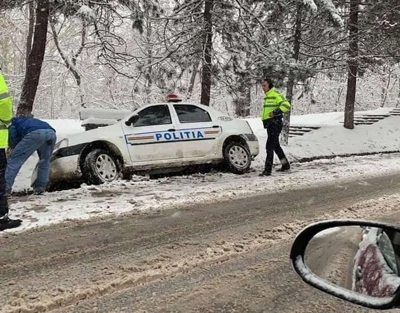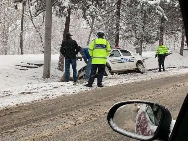 Iarna nu e ca vara. Un polițist nu a adaptat viteza la condițiile de drum, a derapat pe zăpadă și a ajuns cu autospeciala în șanț. „Pățania” a fost surprinsă de un șofer, iar imaginile a devenit virală pe rețelele de socializare.