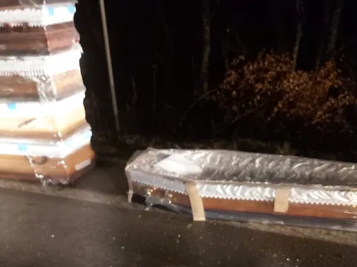 Două camioane au fost implicate într-un accident marți seara, pe DN 13, în zona Pădurii Bogății, din județul Brașov. Unul dintre camioane era încărcat cu coșciuge goale, care au ajuns pe carosabil.