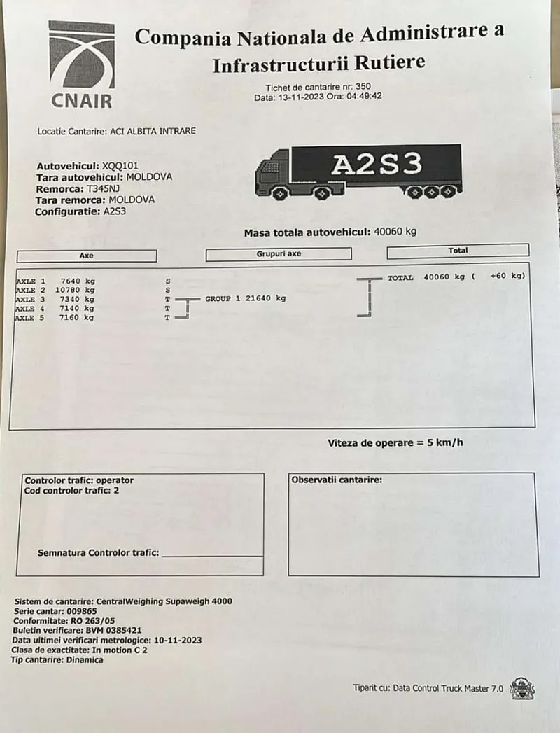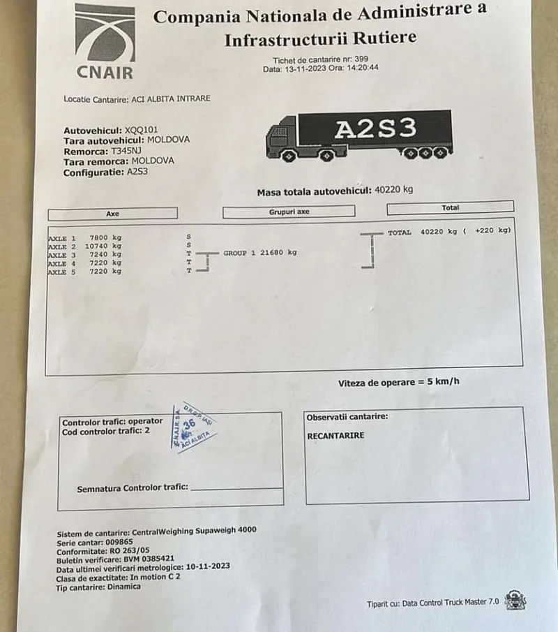 Interesant este și faptul că, potrivit tichetelor de cântărire, cântarul CNAIR din Vama Albița a fost verificat metrologic ultima dată pe 10 noiembrie 2023, adică cu 3 zile înaintea „incidentului”.