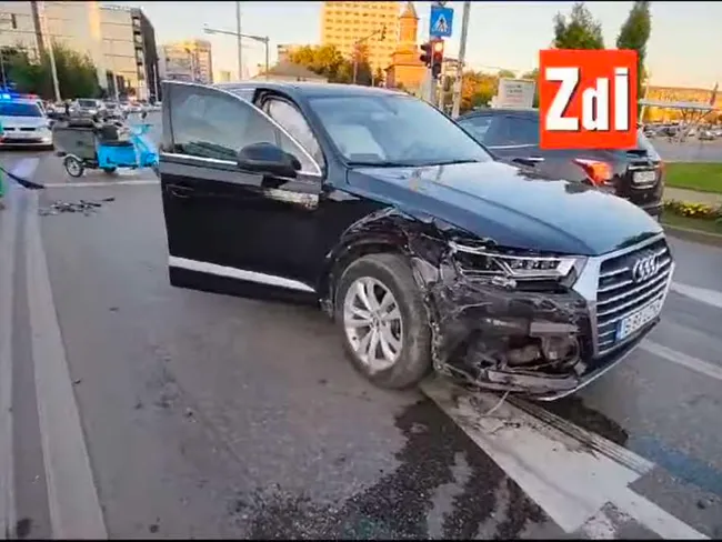 Aflat la volanul Q7-ului său, Lucian Şoric se deplasa dinspre Moldova Center către Pizzeria Domnească şi a izbit un autoturism Ford Focus cu numere de Braşov.
