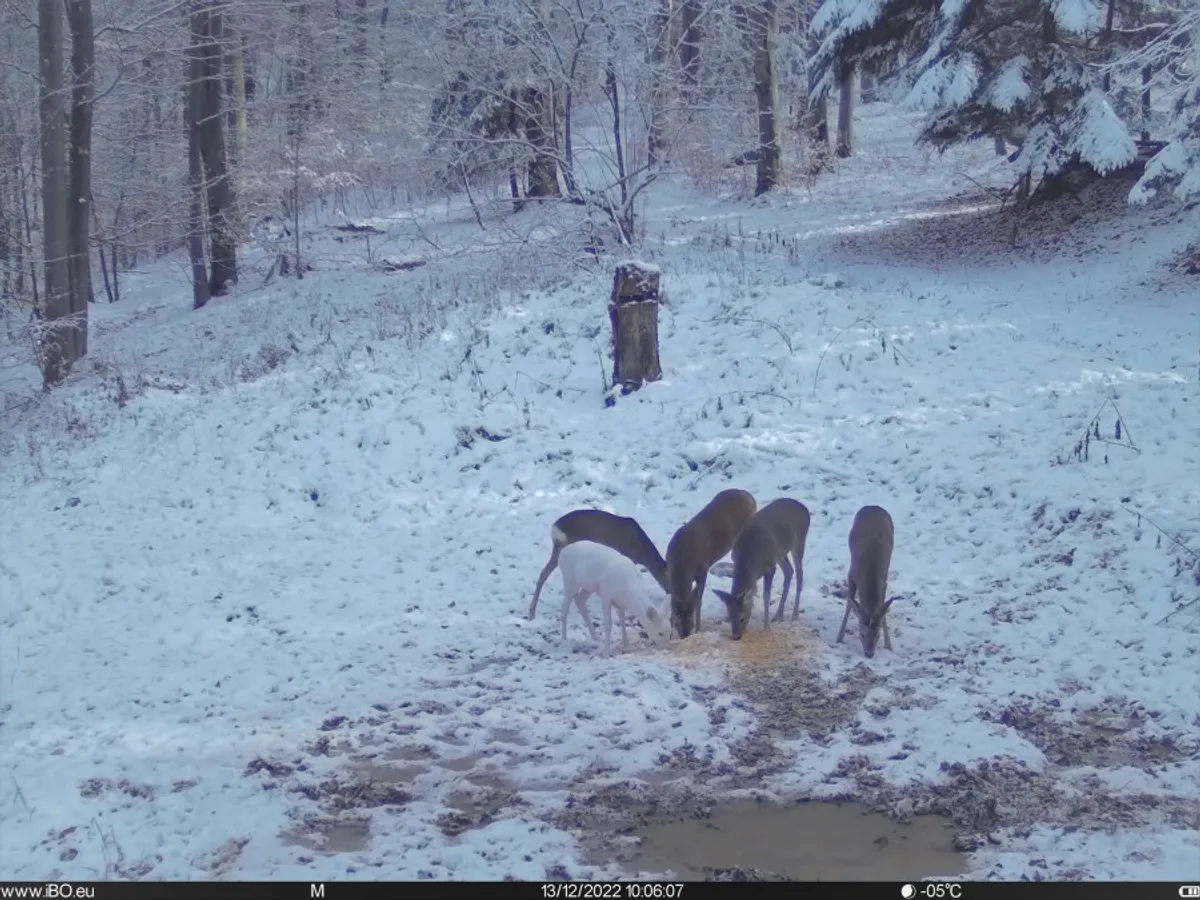 Apariție inedită în Parcul Natural Bucegi, unde o căprioară albă a fost surprinsă la unul dintre punctele de hrănire. Reprezentanții Romsilva spun că o căprioară albă este extrem de rară în fauna din România.