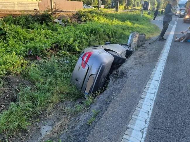 FOTO O șoferiță de 44 de ani s-a răsturnat cu mașina într-o curbă de pe DN 1, în Timișul de Jos