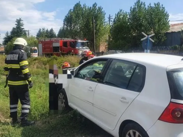 FOTO O șoferiță de 63 de ani nu a oprit la trecerea la nivel. Mașina a fost „pupată” de un automotor