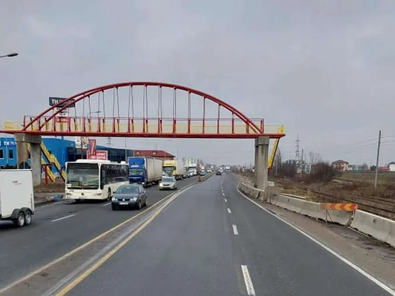 Problema este, însă, că unul dintre stâlpii din beton ai pasarelei a fost ridicat chiar pe mijlocul primei benzi de circulație, îngustând periculos drumul.