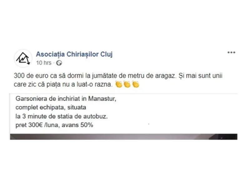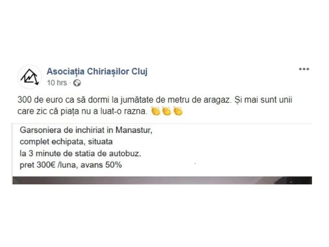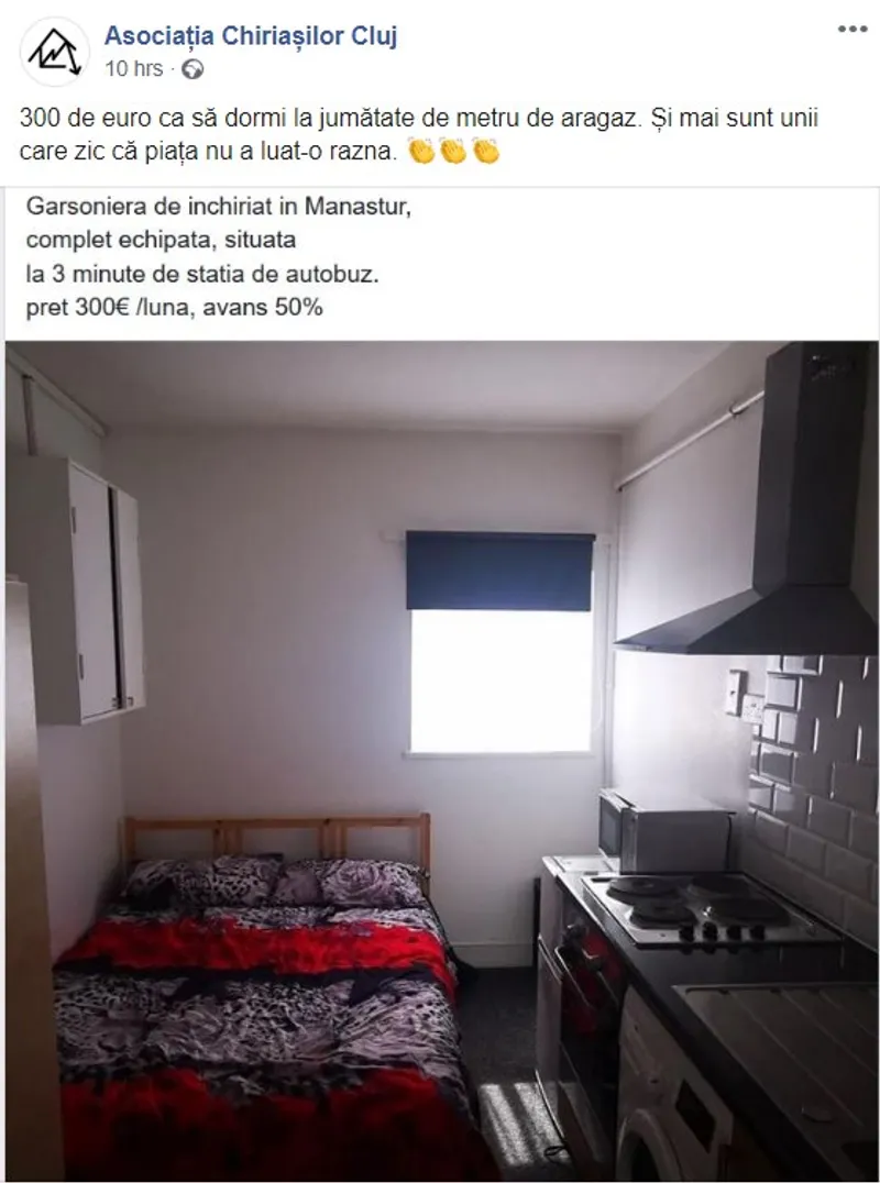 Un proprietar din cartierul clujean Mănăștur a publicat un anunț că închiriază o garsonieră „complet echipată, aflată la 5 minute de stația de autobuz”.