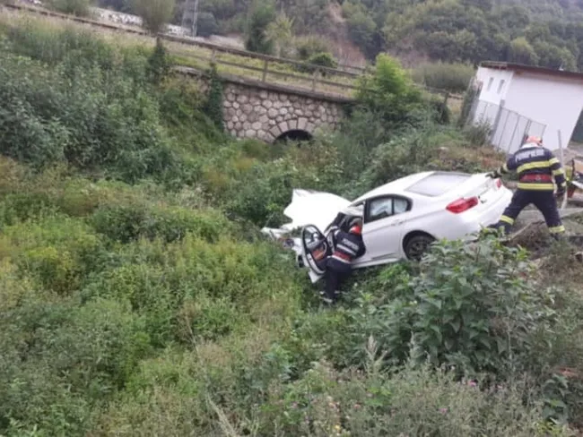 FOTO Șoferul unui BMW a pierdut controlul volanului și a sărit de pe drum pe Valea Oltului