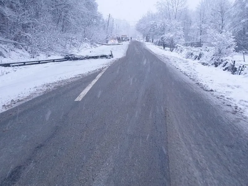 FOTO Stâlpi și copaci, căzuți pe carosabil. Traficul între Râmnicu Vâlcea și Tg. Jiu este perturbat