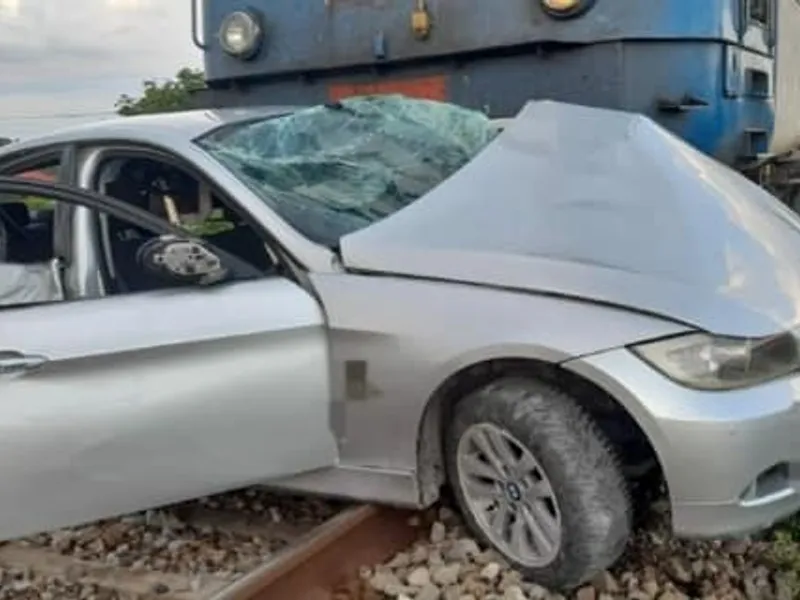 FOTO Un BMW a fost făcut „terci” de un tren de persoane în Ialomița, la Alexeni