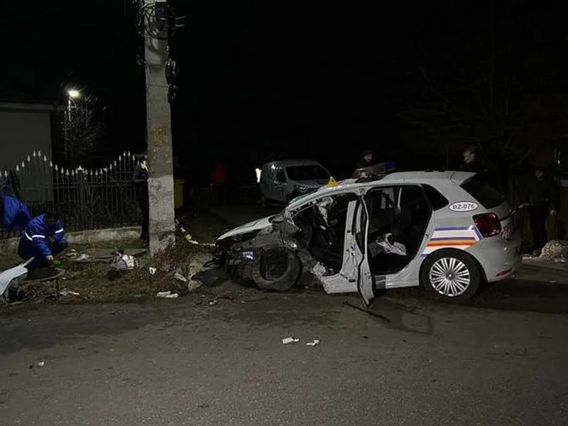 În timpul deplasării, conducătorul autospecialei de poliţie, un bărbat în vârstă de 47 de ani, din Râmnicu Sărat, ar fi intrat în coliziune cu un tub de beton, ulterior lovind un stâlp de electricitate.