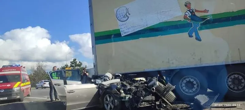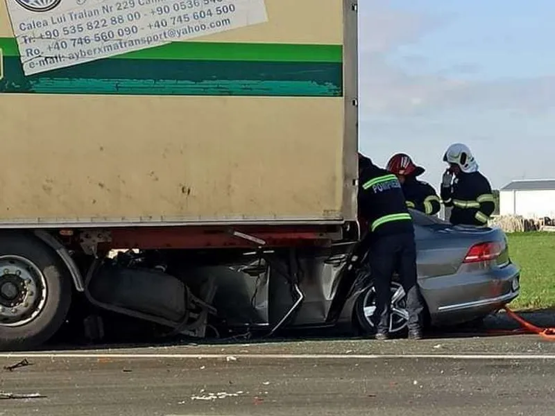 FOTO Un șofer de 36 de ani și-a „decapotat” mașina cu TIR-ul. A murit și el, și pasagera din dreapta