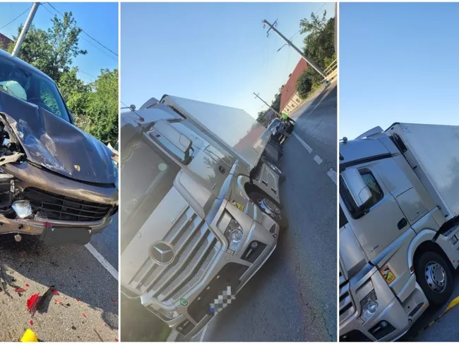 FOTO Un tânăr s-a crezut pilot la volanul unui Porsche, dar nu i-a ieșit. S-a înfipt într-un TIR