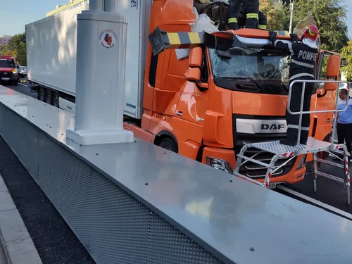 Un camion greu de marfă cu remorcă s-a înfipt în dimineața zilei de joi, 8 septembrie, în bariera limitatoare de înălțime montată la intrarea în Pasajul Unirii din București pe sensul de mers dinspre Parcul Tineretului spre Piața Universității. Bariera a făcut praf cabina TIR-ului, dar, din fericire, în urma incidentului nu au existat victime.