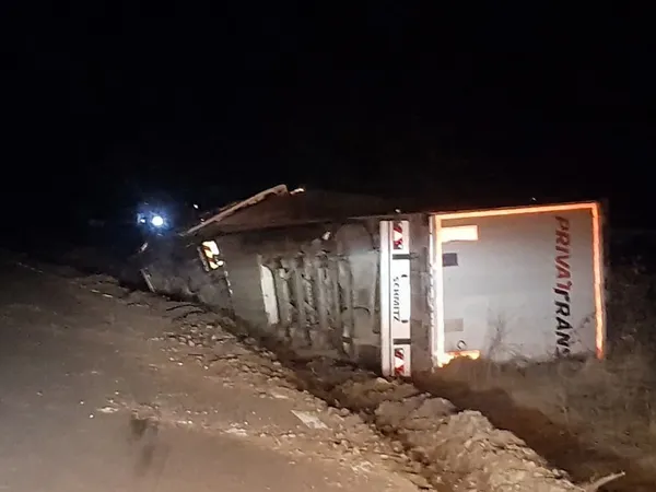 Potrivit Poliţiei judeţene Prahova, autocamionul este răsturnat într-un şanţ. Şoferul, un bărbat în vârstă de 53 de ani, a fost testat cu aparatul etilotest, rezultatul fiind negativ.