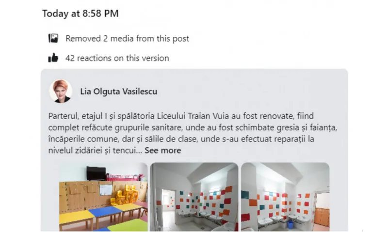 Postarea de pe Facebook a fost însoțită de fotografii cu rezultatul renovării, însă pozele inițiale în care se pot vedea toaletele așezate una lângă alta, fără a fi despărțite în niciun fel, au fost șterse vineri, 14 iulie.