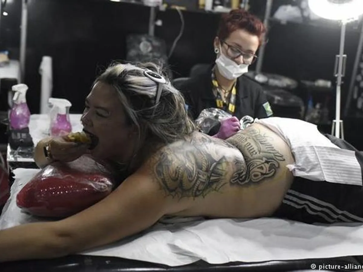 Nu, nu e planul celor două femei din imagine. Acesta este numărul tatuajelor care se fac în Săptămâna Tatuajelor din Rio de Janeiro, Brazilia. Unora le place chiar procesul tatuajului, chiar și durerea. Oare această femeie se bucură de durere la fel de mult ca de snack-ul din care mușcă cu poftă?