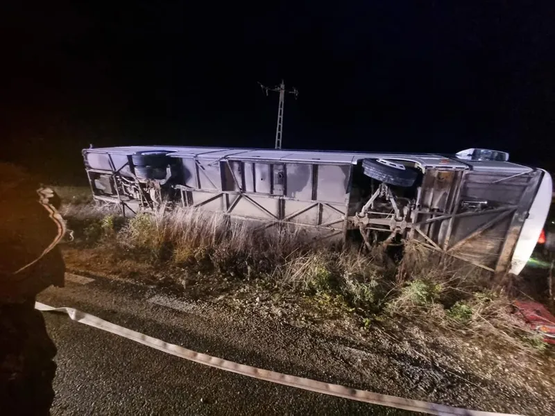 FOTO&VIDEO Autocar cu 33 de persoane, răsturnat. Mai multe persoane sunt transportate la spital