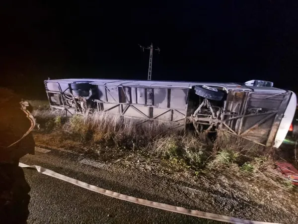 ORA 19,13 Arad: Autocar cu 33 de persoane, rãsturnat; s-a activat Planul roºu de intervenþie