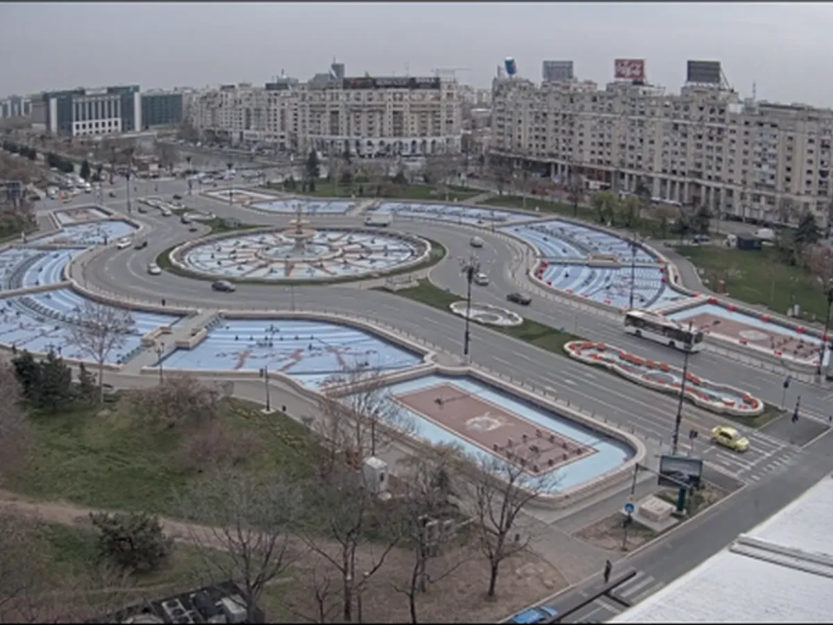 Câteva zeci de mașini așteaptă la semafoarele din centrul Capitalei, altfel o zonă extrem de aglomerată. Deși în apropiere se vede un parc, nu există oameni și nici pietoni pe trotuare.